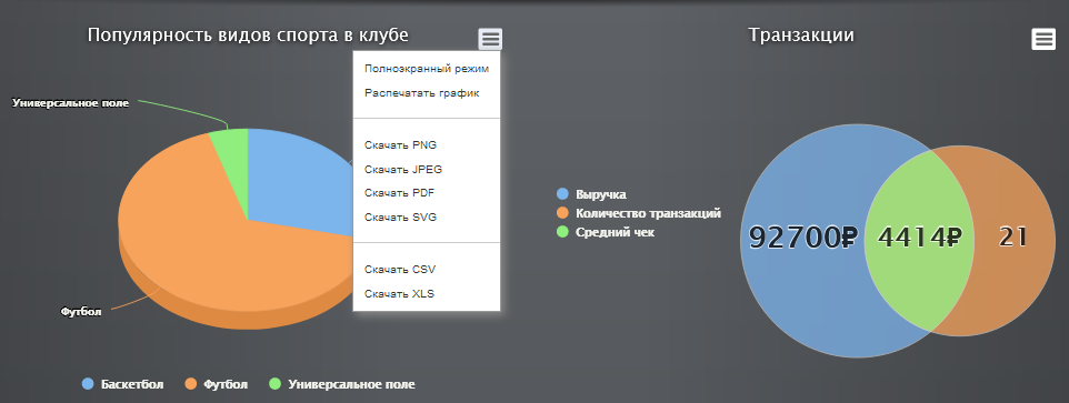 • Отчеты по группам, персональным занятиям, детским тренировкам;